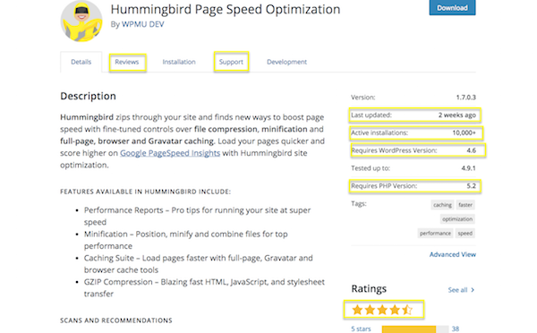 در مثال بالا به کادرهای زرد رنگ دقت کنید. میتوانید موارد مهمی ازجمله توسعهدهنده افزونه، بهروزرسانیهای افزونه، نظرات کاربرانی که از افزونه استفاده کردهاند، امتیازهای افزونه، تعداد نصب فعال و … را بررسی کنید. این موارد شما را در تشخیص استاندارد بودن افزونه یاری میکنند.