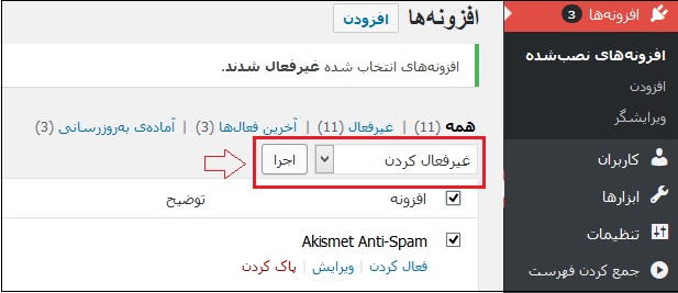 ۲. درصورتیکه قبلاً نسخه پشتیبان تهیه نکردهاید، به پنل مدیریتی وردپرس رجوع کنید و تمام افزونههای نصبشده را غیرفعال کنید.